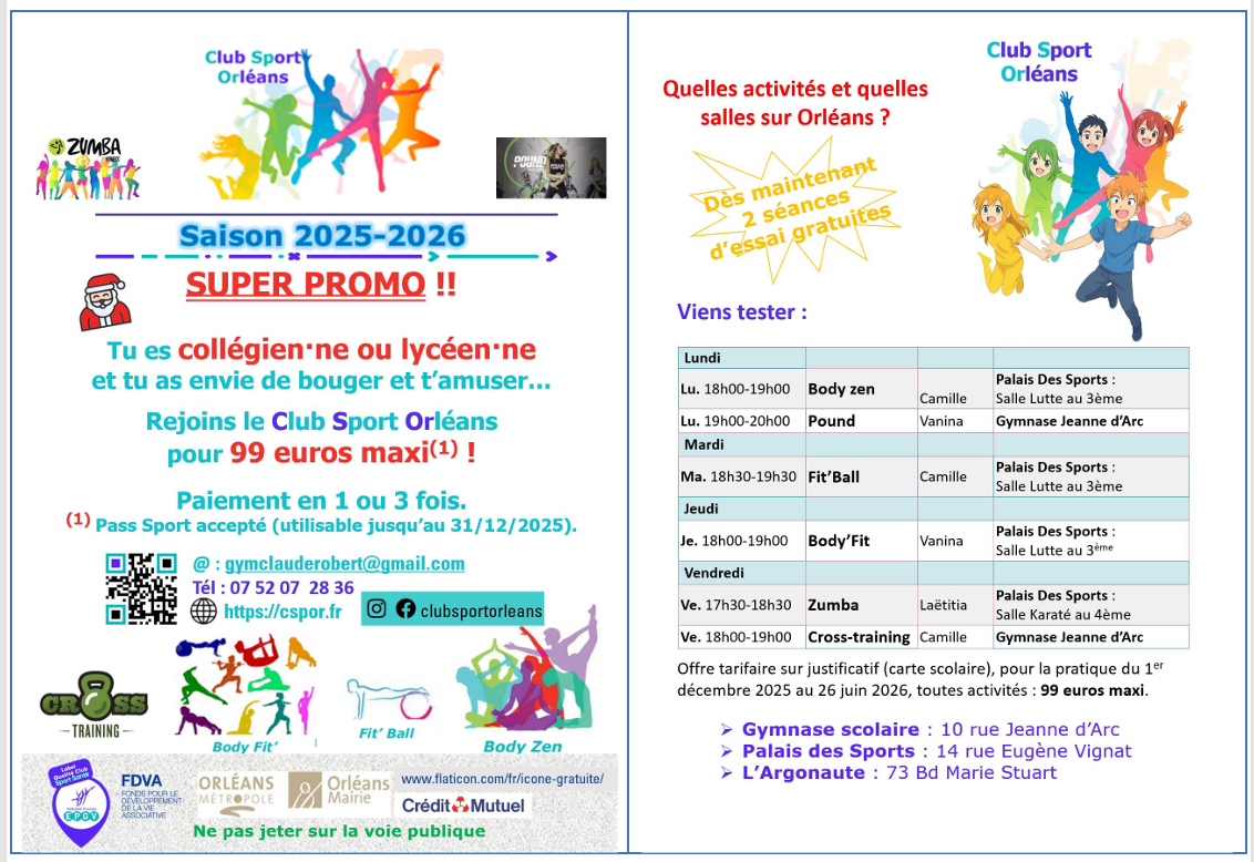 Destinée à tous les scolaires, pour (s’)offrir des séances de Body-zen, Fit’ball, Body’fit, pound, Zumba, cross-training de décembre 2025 à juin 2026 pour 99 euros maxi ! Rejoignez le groupe (voir l’affiche)